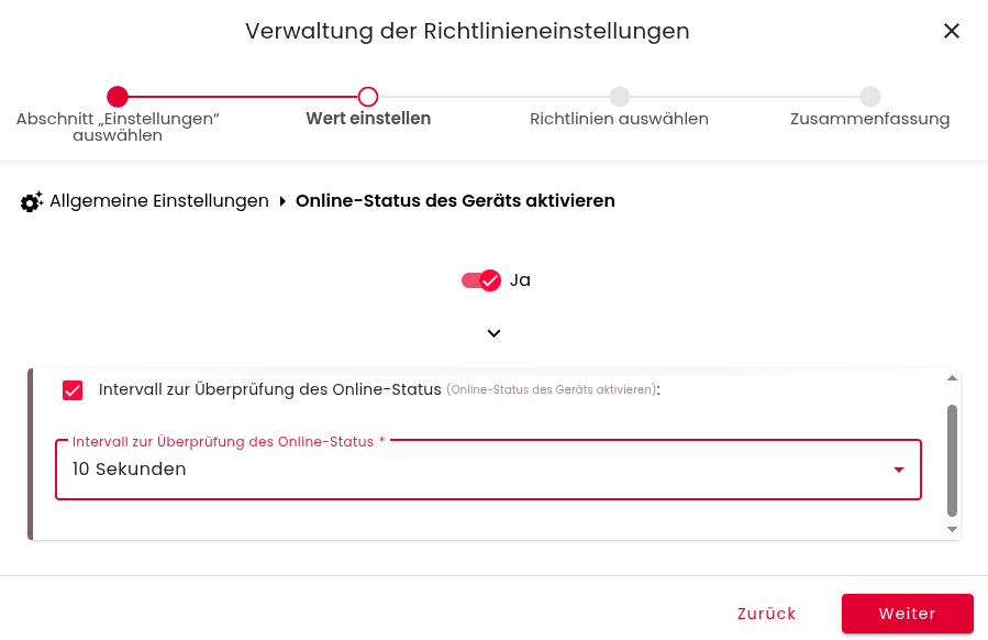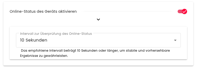 Und wählen Sie das Intervall aus. Mögliche Intervalle sind 3 bis 60 Sekunden, in welchen die Geräte eine erfolgreiche Verbindung zum Server aufbauen müssen, um als Online wahrgenommen zu werden.