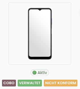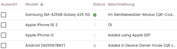 Geräte, welche keine Richtlinie mit Heartbeat-Funktion verwenden, zeigen einen hellgrauen Punkt an. Geräte, welche die Heartbeat Funktion verwenden aber derzeit nicht erreichbar sind zeigen einen dunkelgrauen Punkt, wie das Android-Gerät am Ende der obigen Liste.