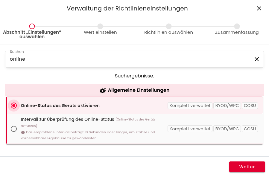 Nachdem die Geräte die ihre Richtlinie aktualisiert haben, steht die neue Funktion zur Verfügung.